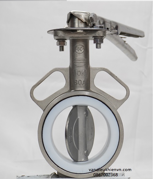 ► Van bướm toàn thân inox tay gạt, gioăng teflon PTFE tiêu chuẩn KS 10K Wafer; Áp lực làm việc MAX 16 Kgf/cm2; nhiệt dộ MAX 150 độ C.